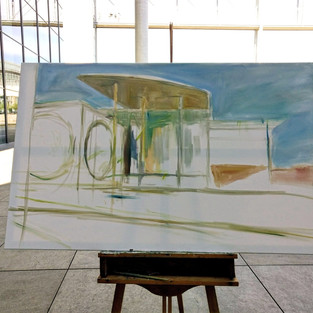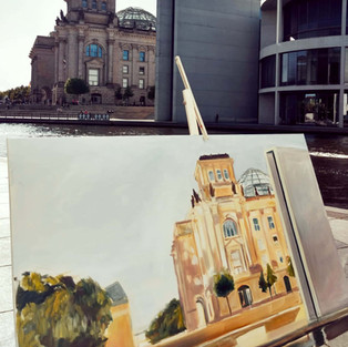 My first painting of the Berlin government district this summer reflects the Mediterranean light, I started it like a watercolour, with only colour schemes to begin with. I then intensified the colours and put in the details of the building's architecture step by step. I was influenced by the Edward Hopper Basel Exhibition which I had seen in winter before the lockdown, and was happy to apply Hopper's rules of contrast.